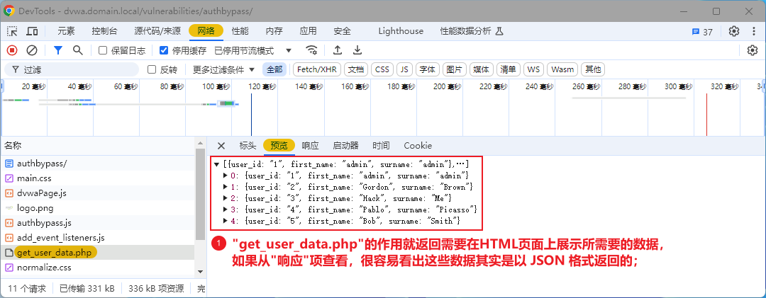 3、了解"get_user_data.php";可以看出只需要使用 GET 请求访问这个页面,其就会自动返回相关的"数据",而这些"数据"刚好是需要在HTML页面上需要展示的"数据";实际上,对于"get_user_data.php"的PHP源代码,官方应该需要给出的,因为只有这个PHP文件中的内容才可以体现出"MEDIUM"与"HIGH"难度之间的区别,可惜在DVWA的官方提示中,官方只是在注释中提示我们需要关注这个文件的源代码;后面我们需要自己找出这份文件查看PHP的源代码;
