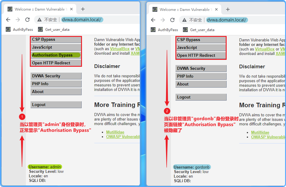 现在以非管理员"gordonb/adc123"登录DVWA开始进行解题操作;在LOW难度下,当使用"gordonb"用户登录DVWA时,DVWA会将"Authorisation ByPass"漏洞页面给隐藏了起来,见下对比图:
